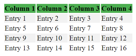 You can embed the CSS code in the head section using a <style> element. In the following example, we’re going to set the table header to have a green background, while the other rows will alternate between light gray and white: