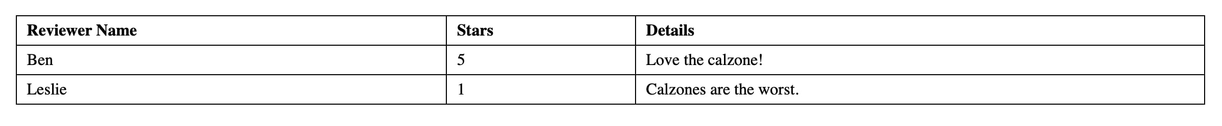 INSERT INTO user_review (reviewer_name, star_rating, details) VALUES ('Ben', '5', 'Love the calzone!');