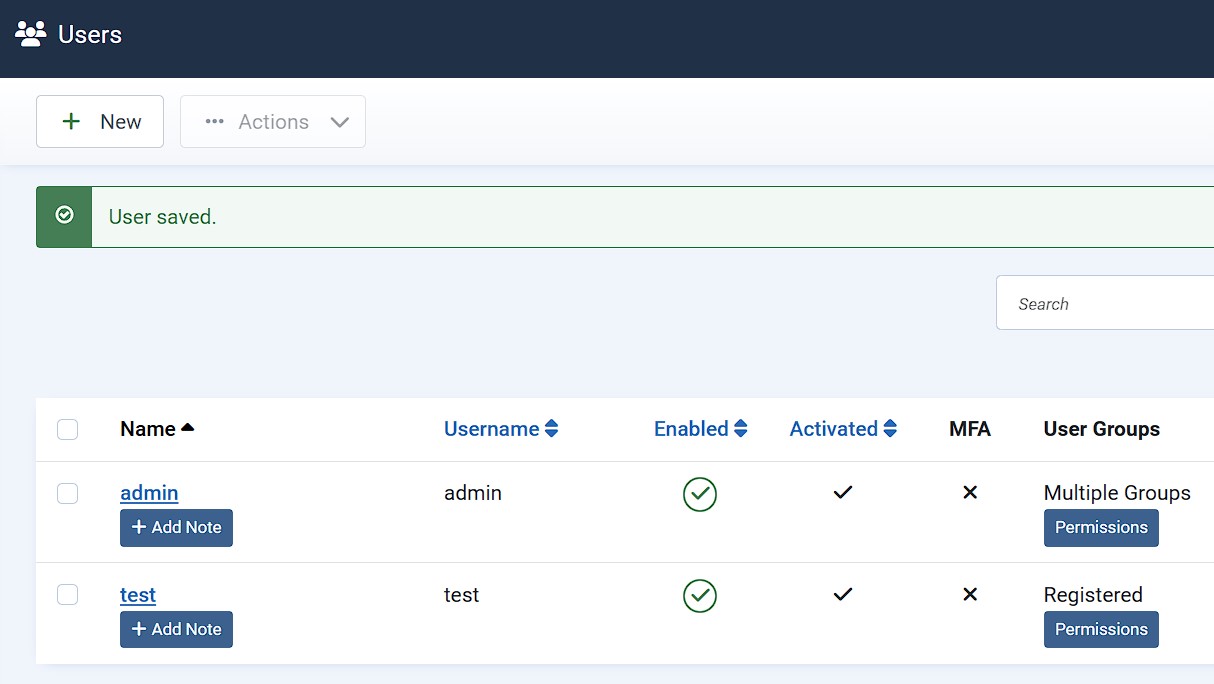 If the groups and assigned access rights meet your expectations, you can create new user accounts and assign them to the desired groups. To do this, expand the “Users” menu and click on the “New User” button (plus sign). There, you need to provide the new user’s name, username, and a valid email address, and in the “Assigned Groups” tab, indicate which group or groups this new user account should belong to. Finally, press “Save & Close” to create the account. It should now appear alongside the Administrator account (Super User) in the user listing.