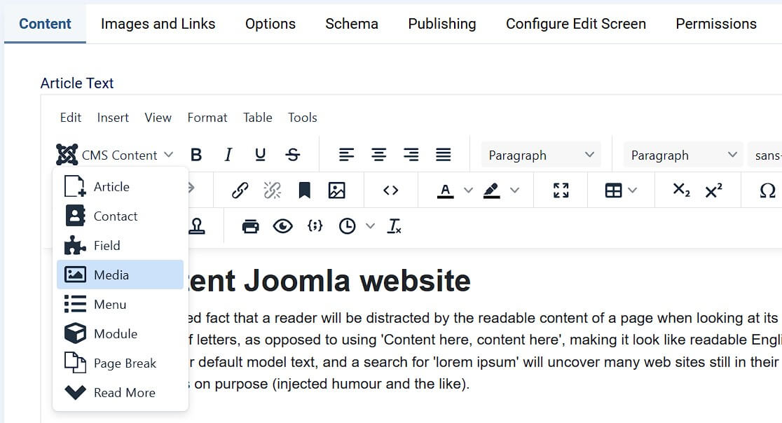 Of course, you should also integrate images into your web project, as even the most interesting content attracts few readers without visual appeal. To enhance a post with photos and graphics, simply open it via the Articles menu and choose “CMS Content” and “Media” in the editor: