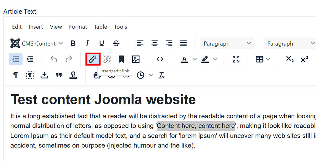 For internal linking, press the “Article” button and then select the desired post from your Joomla project.