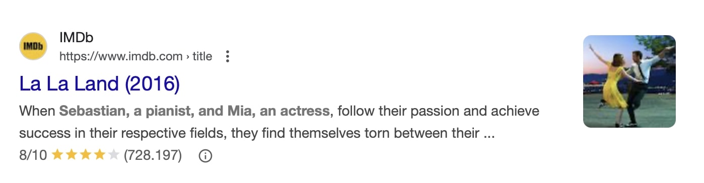 Star ratings on your website have another advantage: if you implement them using schema.org, the ratings can also appear in Google SERPs as rich snippets. This way, they act as eye-catchers even before customers visit your page, potentially generating more traffic. In the following screenshot, a search for the six-time Oscar-winning film “La La Land” was conducted on Google. The SERPs show the following entry from the Internet Movie Database (IMDb) with the average user rating on a scale from 1 to 10, a graphical representation as a star rating, and the number of votes submitted: