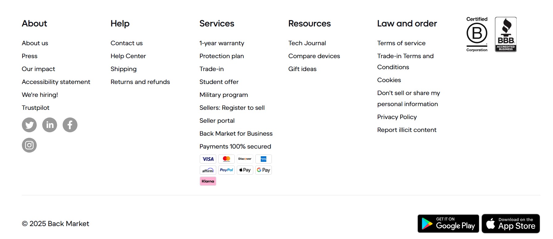 The online marketplace Backmarket sells refurbished electronics from cell phones to epilators. The footer offers some specialties. This includes a link to the review portal Trustpilot, whose reviews exude confidence and simultaneously build trust. Similar advantages are achieved by mentioning the 12-month warranty. In the “About us” footer section, the company’s mission is quickly and precisely outlined.