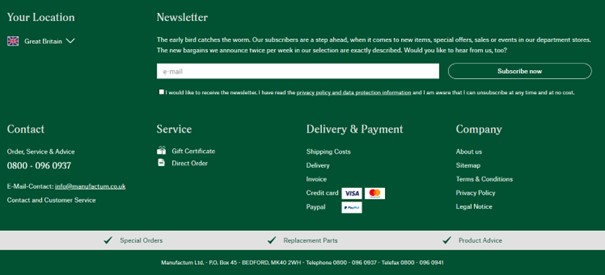 The German mail-order company Manufactum operates a large online store as well as physical department stores at 18 locations. Its website footer is equally comprehensive—yet remains well-organized and user-friendly. It also promotes newsletter sign-ups by offering a coupon incentive. A narrow gray bar placed above the App Store and social media icons provides subtle prompts designed to encourage visitors to make a purchase.