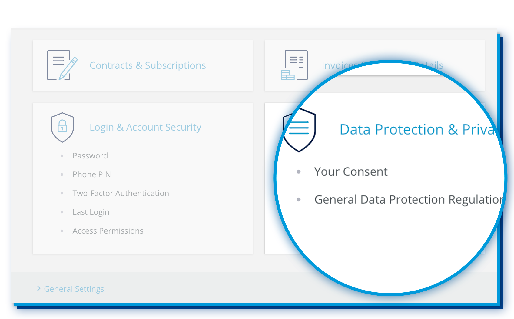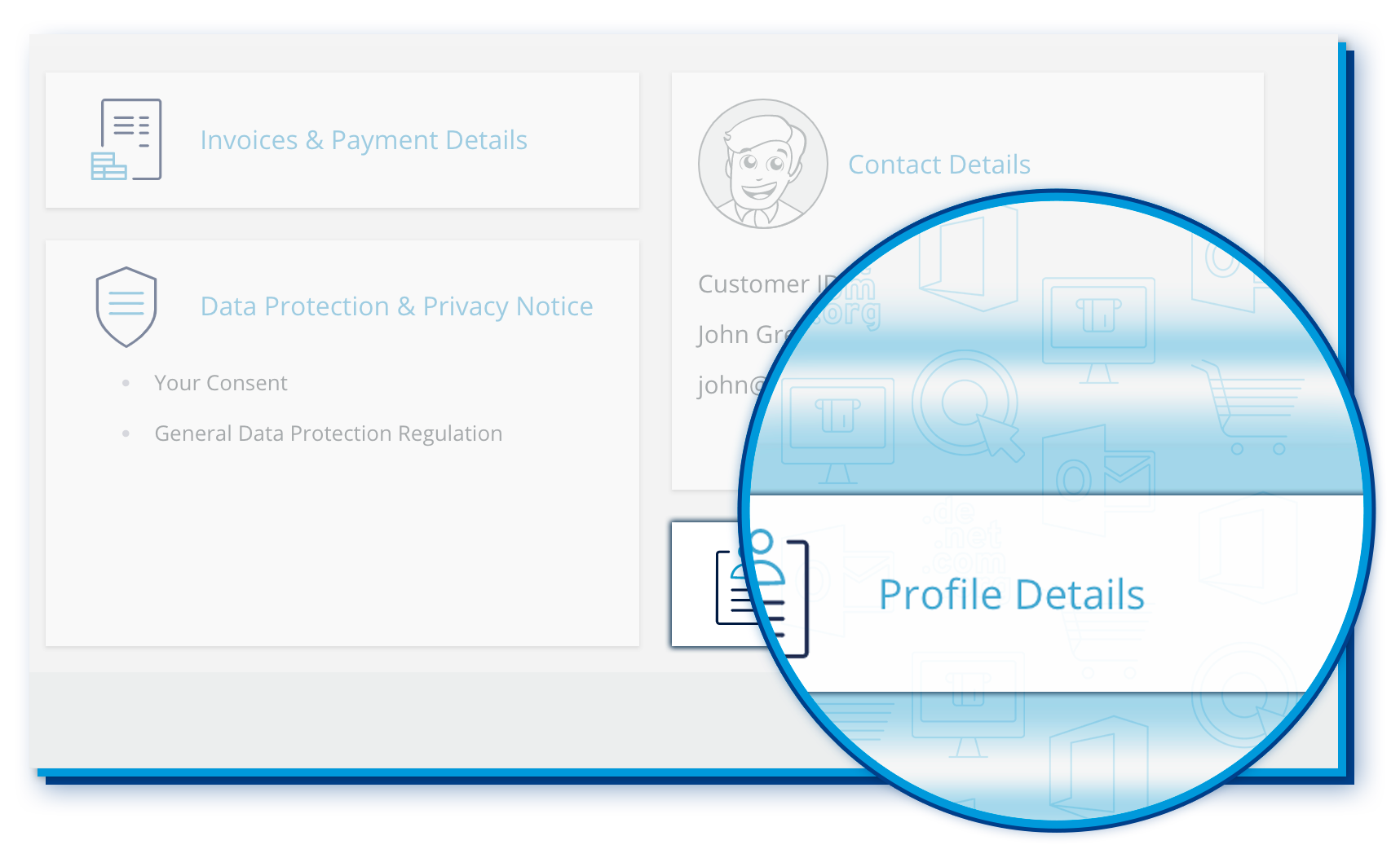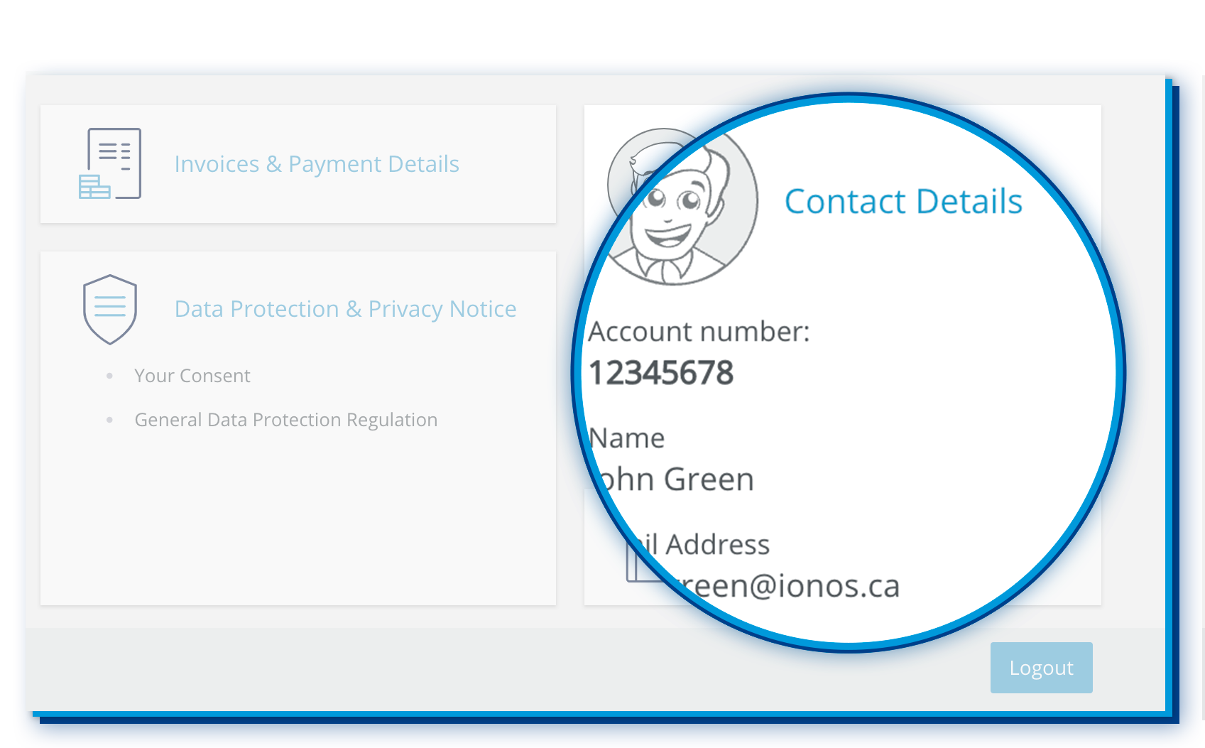In the top-right of the menu bar, you will find all topics related to your user account, such as your contact details, invoices, payment details and much more. Easily keep track of your invoices or update your payment details at any time. You can also easily manage your data protection settings and update your customer password.